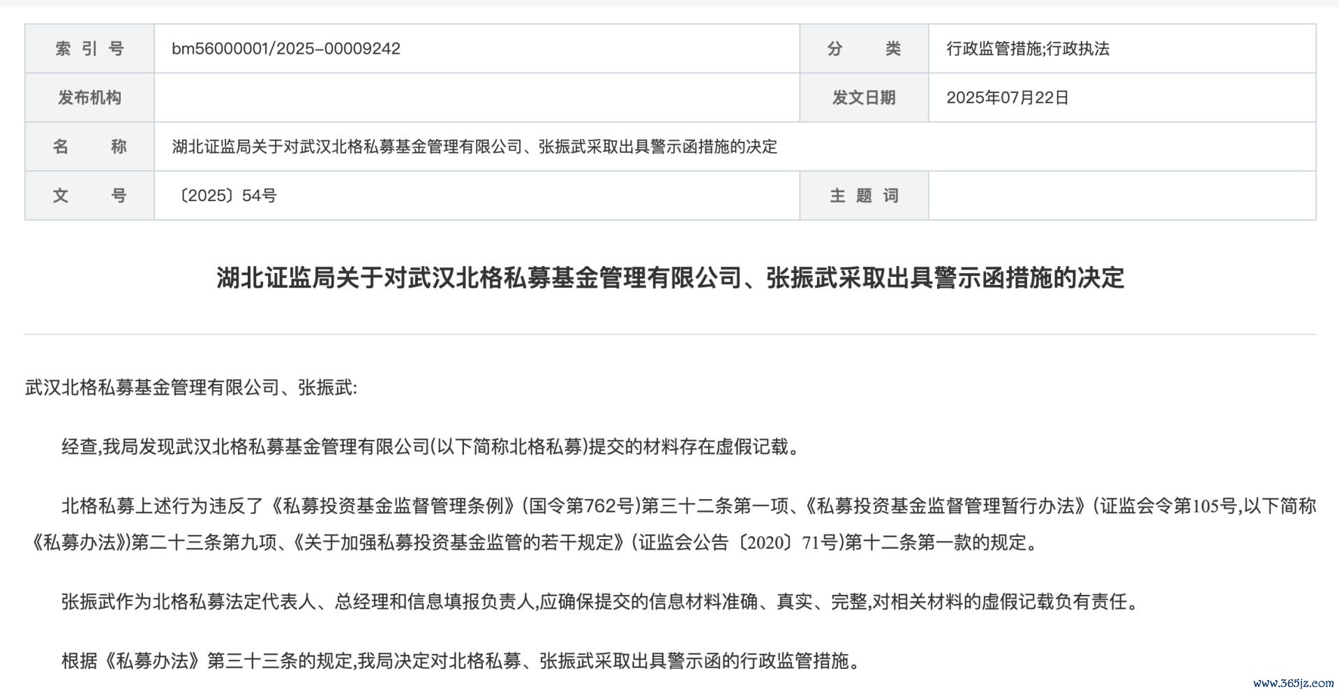 然而,这份光鲜并未维持太久。在完成备案仅仅3个月后的2025年7月22日,湖北证监局便对北格私募及张振武本人采取了出具警示函的监管措施。监管部门明确指出,北格私募在提交的材料中存在虚假记载的行为。虽然湖北证监局并未在公开信息中进一步指明具体是哪些材料存在虚假记载,但从其违反的法律法规内容来看,性质十分明确。