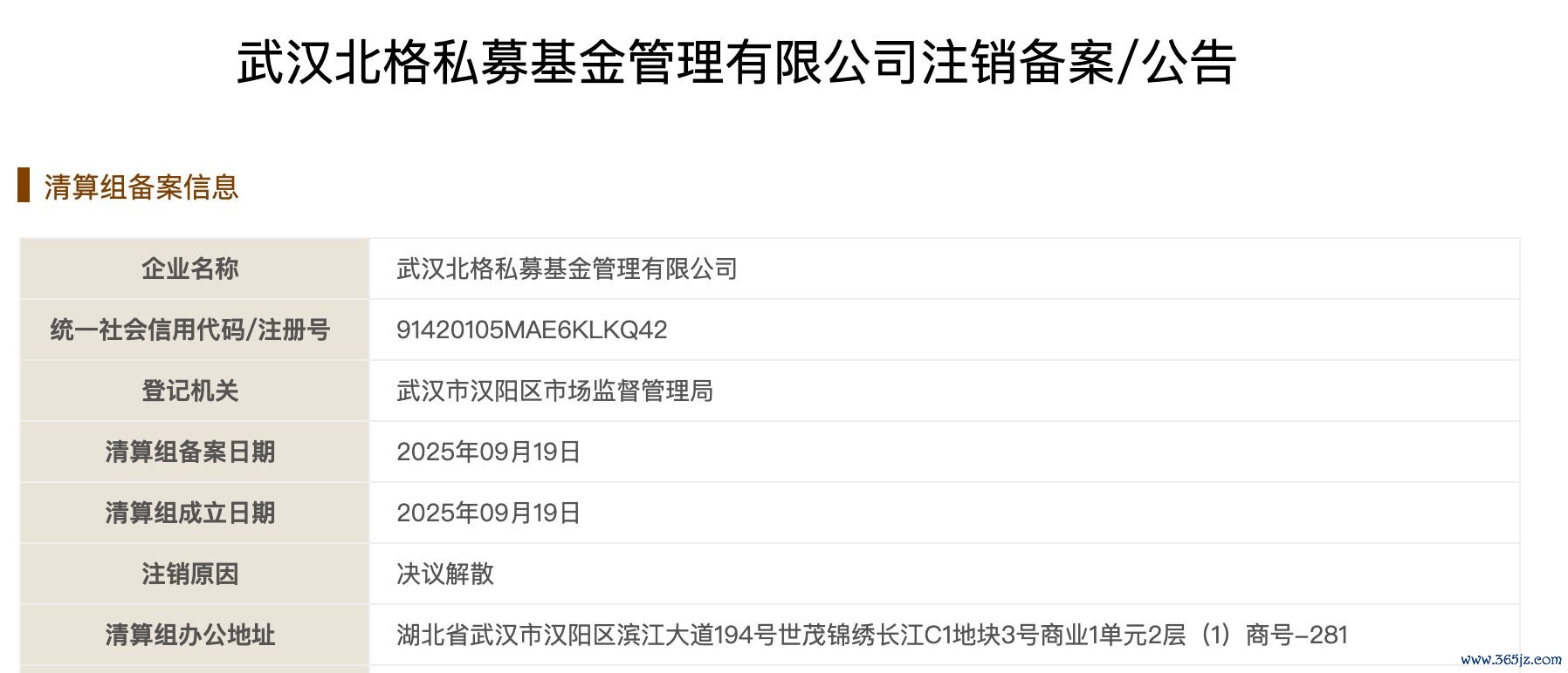 面对监管的重拳出击,北格私募的运作迅速走向了终局。在收到警示函仅仅2个月后,北格私募便决议解散。根据国家企业信用信息公示系统披露的数据,该公司于2025年9月19日发布了债权人公告信息,拟因决议解散向公司登记机关申请注销登记,公告期设定为2025年9月19日至2025年11月3日。2025年12月1日,北格私募正式完成了工商注销程序。